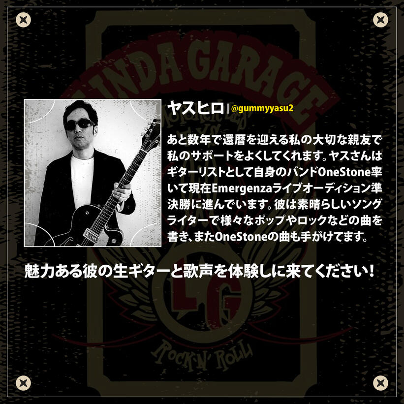あと数 年で 還 暦を迎える私 の 大 切 な 親 友で 私のサポートをよくしてくれます。ヤスさんはギターリストとして自身のバンドOneStone率いて現在Emergenzaライブオーディション準決勝に進んで います。彼 は 素 晴らしいソングライターで 様々な ポップ やロックなどの 曲を書き、またOneStoneの曲も手がけてます。魅力ある彼の生ギターと歌声を体験しに来てください!