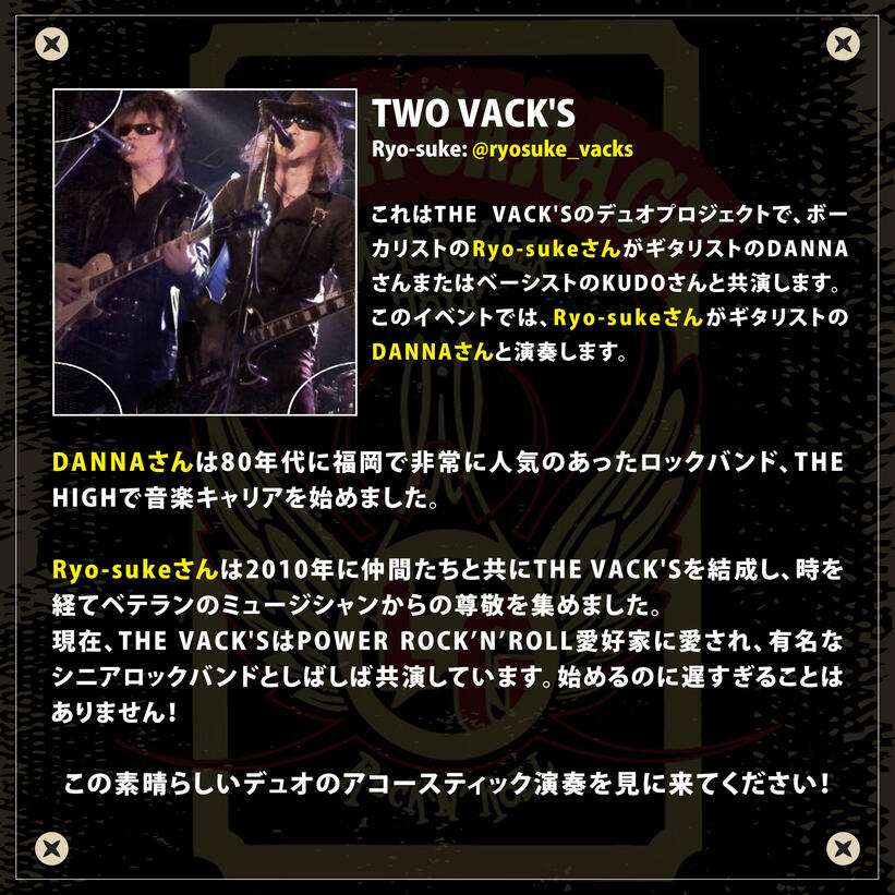 このイベントでは、Ryo-sukeさんがギタリストのDANNAさんと演奏します。DANNAさんは80年代に福岡で非常に人気のあったロックバンド、THE HIGHで音楽キャリアを始めました。Ryo-sukeさんは2010年に仲間たちと共にTHE VACK'Sを結成し、時を経てベテランのミュージシャンからの尊敬を集めました。