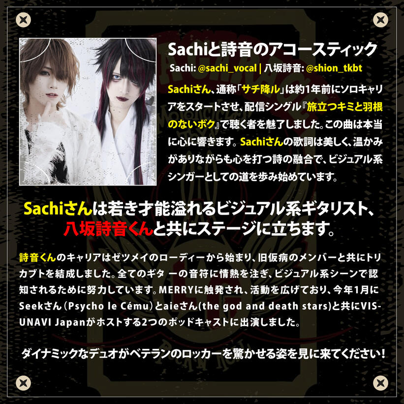 Sachiさん、通称「サチ降ル」は約1年前にソロキャリアをスタートさせ、配信シングル『旅立つキミと羽根のないボク』で聴く者を魅了しました。この曲は本当に心に響きます。 Sachiさんの歌詞は美しく、温かみがありながらも心を打つ詩の融合で、ビジュアル系シンガーとしての道を歩み始めています。Sachiさんは若き才能溢れるビジュアル系ギタリスト、八坂詩音くんと共にステージに立ちます。詩音くんのキャリアはゼツメイのローディーから始まり、旧仮病のメンバーと共にトリカブトを結成しました。全てのギタ ーの音符に情熱を注ぎ、ビジュアル系シーンで認知されるために努力しています。MERRYに触発され、活動を広げており、今年1月にSeekさん(Psycho le Cému)とaieさん(the god and death stars)と共にVISUNAVI Japanがホストする2つのポッドキャストに出演しました。ダイナミックなデュオがベテランのロッカーを驚かせる姿を見に来てください!