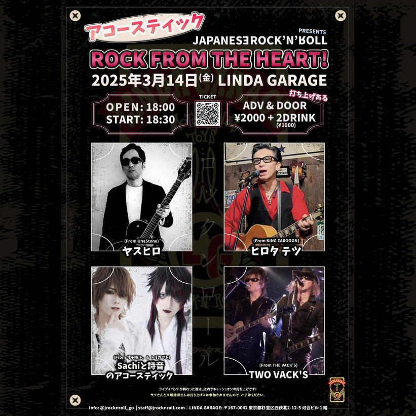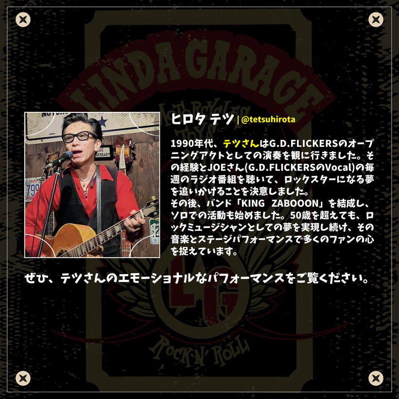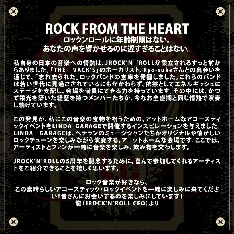 私自身の日本の音楽への情熱は、JROCK’N’ROLLが 設 立されるずっと前 からありました 。「THE VACK’S」のボーカリスト、Ryo-sukeさんとの出会いを通て、「忘れ去られた」ロックバンドの宝庫を発掘しました。これらのバンドは若い世代に見過ごされているにもかかわらず、依 然としてエネ ル ギッシュにステージを支 配し、会 場を満員にできる力を持っています。その中には、かつて栄光を築いた経歴を持つメンバーたちが、今なお全盛期と同じ情熱で演奏し続けています。この発見が、私にこの音楽の宝物を祝うための、アットホームなアコースティックイベントをLINDA GARAGEで開催するインスピレーションを与えました。 LINDA GARAGEは、ベテランのミュージシャンたちがオリジナルや懐かしいロックチューンを楽しみながら演奏する、アットホームな 会 場で す。ここで は、アーティストとファンが 一 緒 に音 楽を楽しみ、飲 み 物を交わします。JROCK’N’ROLLの5周年を記念するために、喜んで参加してくれるアーティストをご紹介できることを嬉しく思います。